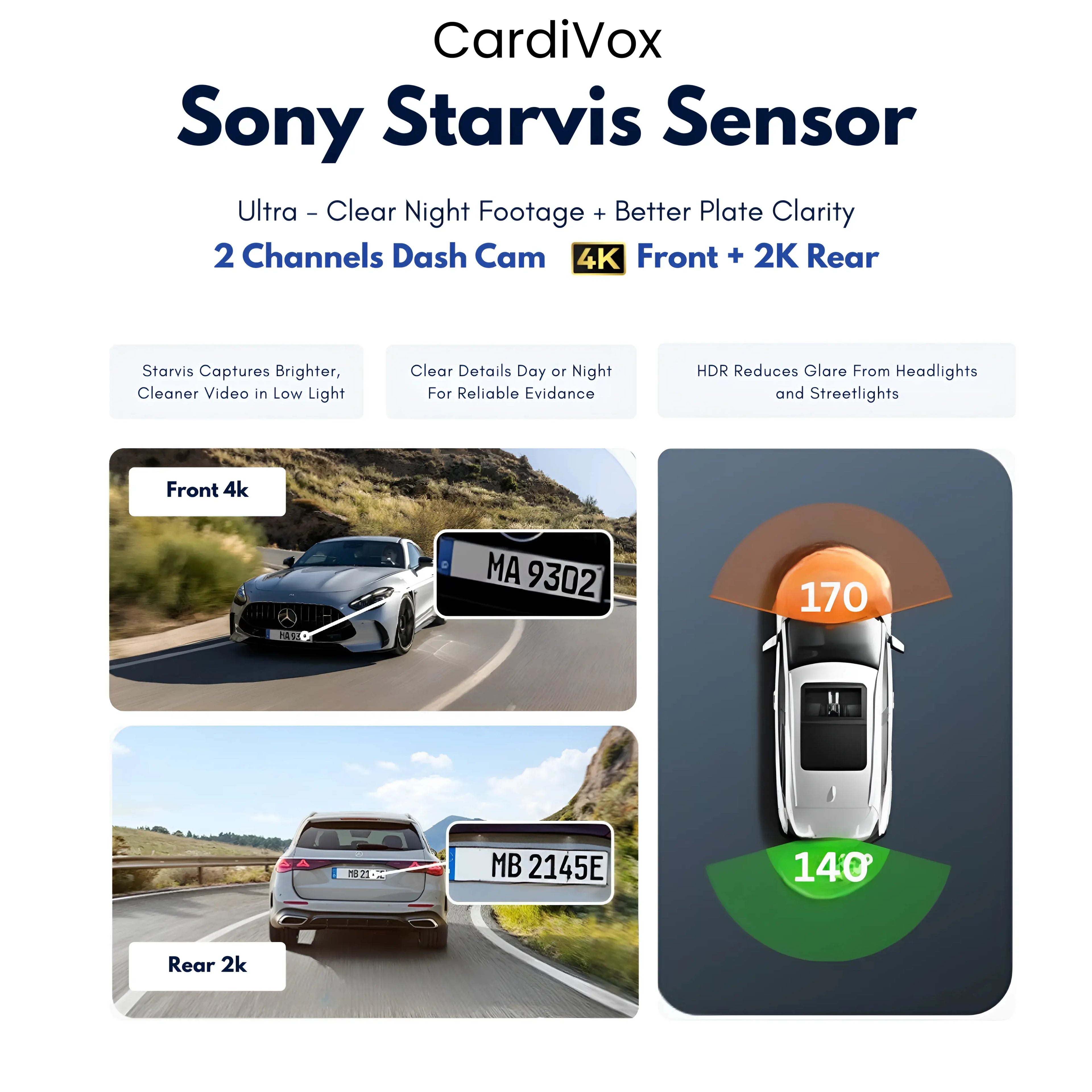 The CardiVox A11 includes the front dash cam, rear camera, mounting accessories, car power cable, user manual, and required installation accessories for Parking Mode (hardwire setup). Contents may vary by bundle.